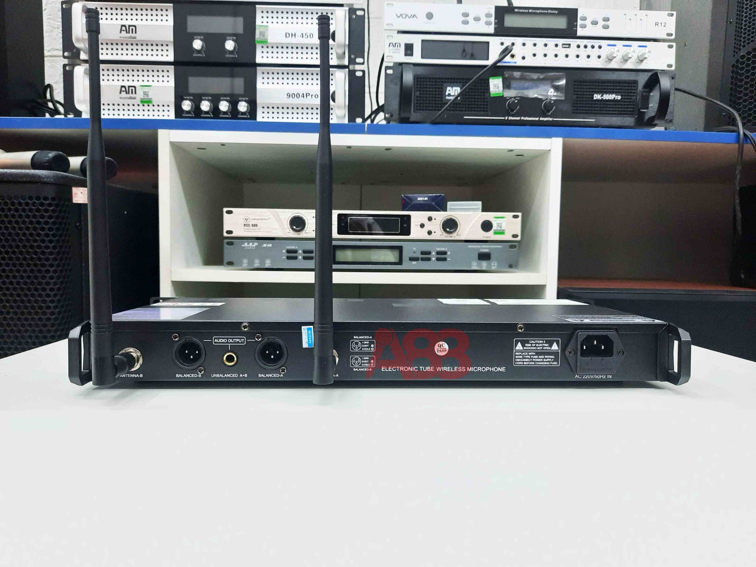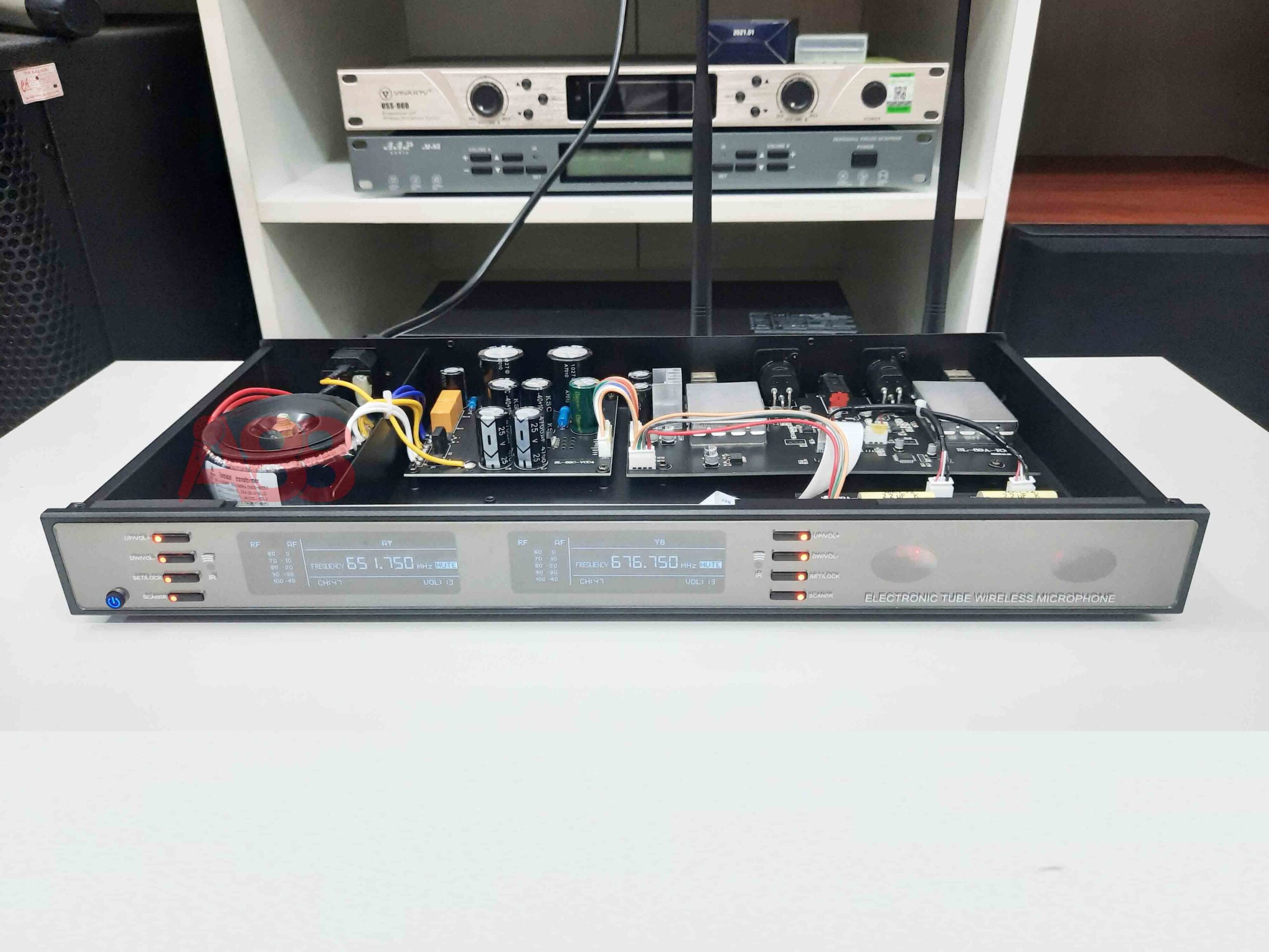 Các chi tiết ở mặt trước đầu thu bao gồm: Màn hình hiển thị tần số tiếp sóng micro, màn hình LCD. Hai bên là nút điều chỉnh từng micro riêng biệt. Ở phía bên phải là 02 lỗ tròn nhìn rõ 2 bóng đèn điện tử hoạt động