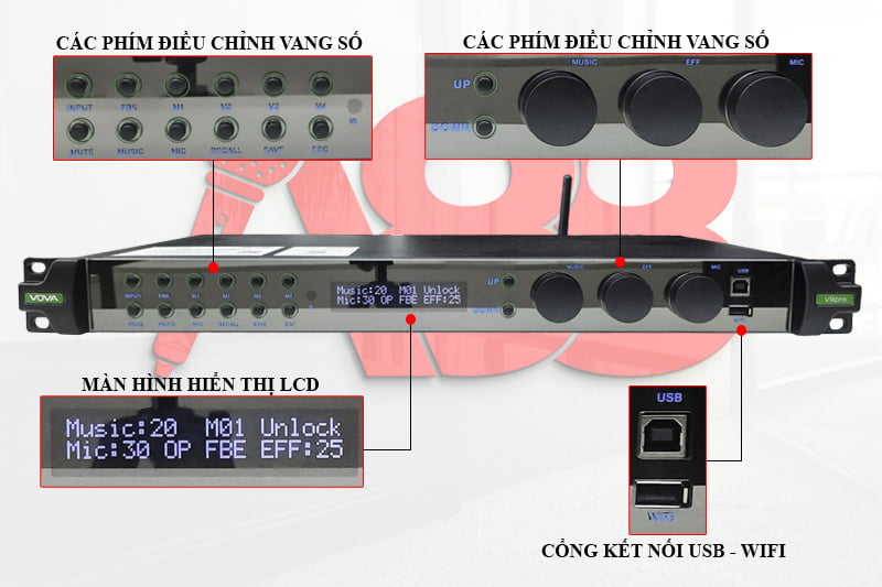 Mặt trước của vang số khá tinh tế và lạ mắt khi được tráng gương , cùng với đó là các cụm nút phím tùy chỉnh được bố trí khoa học, chi tiết gồm màn hình LCD, hệ thống nút điều chỉnh hiệu ứng, 3 nút chỉnh micro / reverb / music, cổng USB.